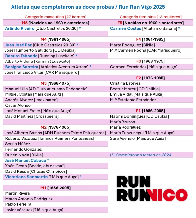A atleta quedou sen título en varias edicións por perderse unha das probas. O rexedor pediu aos asistentes “que o ano que vén sexan 300 os atletas que acabasen as doce carreiras” fronte aos corenta (vinte e sete homes e trece mulleres) que cumpriron coa ducia de esixentes citas en 2025.